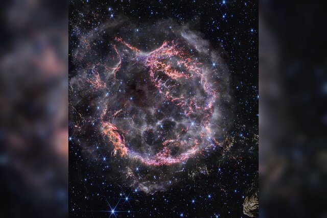 این عکس واضح از دوربین NIRCam تلسکوپ فضایی جیمز وب، رشته‌ها و گره‌های هنوز داغ را در بقایای ابرنواختر نشان می‌دهد. پوسته بیرونی سفید و دودمانند در حال گسترش، حدود ۲۰ سال نوری قطر دارد. مجموعه‌ای از پژواک‌های نوری از انفجار فاجعه‌بار ستاره بزرگ نیز در تصاویر دقیق جیمز وب از محیط میان‌ستاره‌ای اطراف شناسایی شده‌اند.