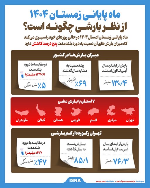 ماه پایانی زمستان امسال ۱۴۰۴ در حالی روزهای خود را سپری میکند که میزان بارشهای آن نسبت به دوره بلندمدت پنج درصد کاهش دارد. میزان بارش های تاکنون کشور در مقایسه با ۷۷.۱میلیمتر مدت مشابه سال گذشته از رشد ۶۹ درصدی برخوردار شده است.
